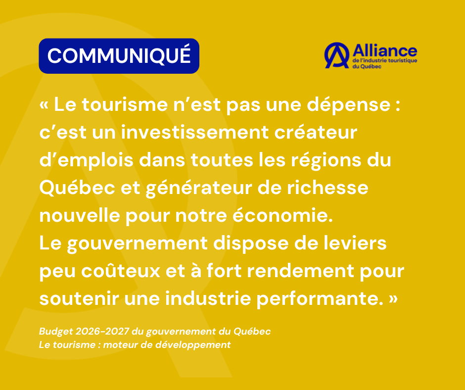 Québec, le 5 novembre 2025 – L’Alliance de l’industrie touristique du Québec (Alliance) prend acte du budget déposé par le ministre fédéral [...]